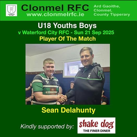 In the recent U18’s Youths Boys fixture away v Waterford RFC the shakedogclonmel Player Of The Match recognition was awarded to Sean Delahunty by his U18’s Head Coach Gerrit Huisamen.