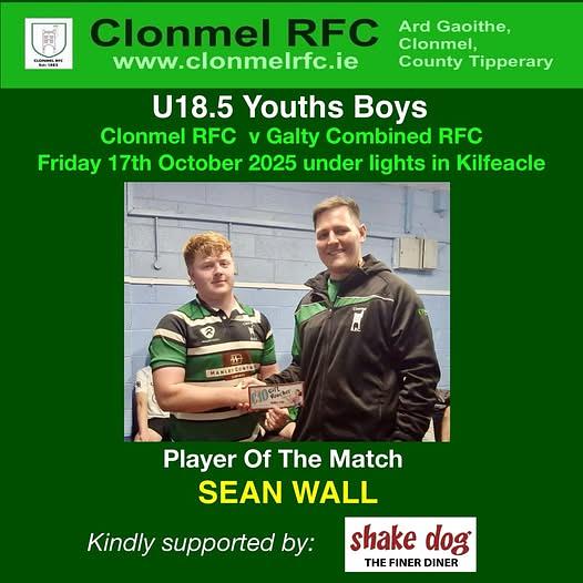 In Friday night’s 17th October U18.5 Youths Boys East Pan Munster fixture away v Galty Combined RFC (Mitchelstown & Kilfeacle) where Clonmel came away as victors in a close encounter 12-10 at full time, the Shake Dog Player Of The Match recognition was awarded to Sean Wall