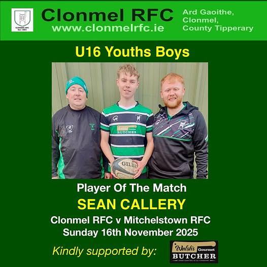 Special thanks to Walsh's Gourmet Butcher, Showgrounds SC Clonmel for their generous sponsorship support of the Clonmel RFC U16’s team.