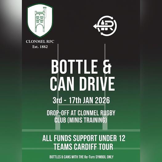 The U12 squad are looking for your big help for you to donate and bring all of your bottles and cans after the Christmas Festivities to the club in Ard Gaoithe from the 3rd to the 17th of January 2026 to help them achieve their fundraising goal to play rugby on their tour to Cardiff in Wales at the end of the season.