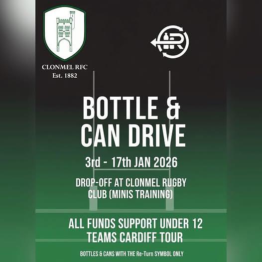 The U12 squad are looking for your big help for you to donate and bring all of your bottles and cans after the Christmas Festivities to the club in Ard Gaoithe from the 3rd to the 17th of January 2026 to help them achieve their fundraising goal to play rugby on their tour to Cardiff in Wales at the end of the season.