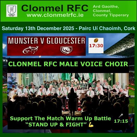 Clonmel RFC are extremely proud to announce that the Clonmel RFC Male Voice Choir are giving a Stand Up and Fight performance prior to kickoff of this ERC Round 01 Battle between Munster and Gloucester this coming Saturday 13th December 2025 in Pairc Uí Chaoimh, Cork