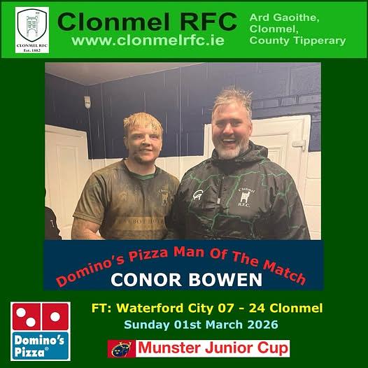 Special thanks to Dominos Pizza, Cashel Road, Clonmel for their continuous and generous sponsorship support of the Man Of The Match Award.