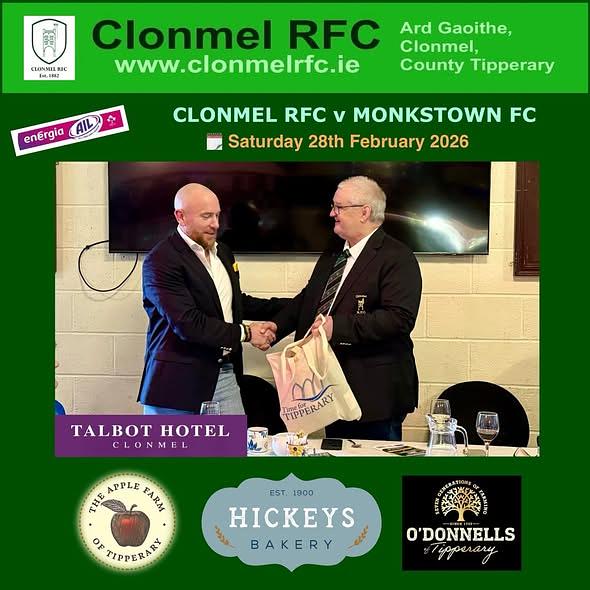 Clonmel RFC President Paul McGrath presenting David Mahon President of Monkstown FC with some local produce from Trass’s Apple Farm, Hickeys Bakery and O’Donnell Crisps at the AIL Pre-Match Lunch reception held in the Ard Gaoithe Clubhouse prior to kick off of our Energia AIL round 14 fixture and some photos of guests in attendance.
