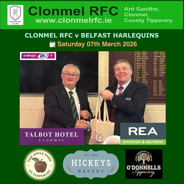Clonmel RFC President Paul McGrath presenting Chris Rogers of Belfast Harlequins RFC with proud local produce from Trass’s Apple Farm, Hickeys Bakery and O’Donnell Crisps at the AIL Pre-Match Lunch reception held in the Ard Gaoithe Clubhouse prior to kick off of our Energia AIL round 15 fixture and some photos of guests in attendance.