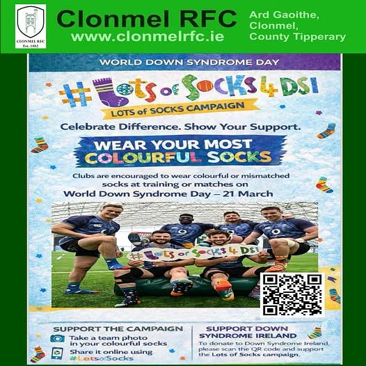 Clonmel RFC is supporting World Down Syndrome Day this coming Saturday 21st Mar 2025, all teams from Clonmel RFC will either wear odd/mismatched socks or colourful socks while training or playing a rugby match rugby on the day.