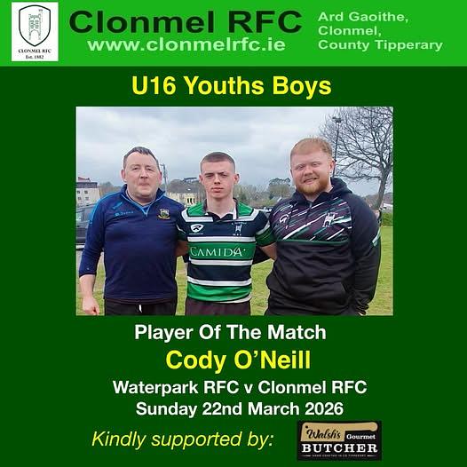 Special thanks to the Gourmet Butcher, Showgrounds SC, Clonmel for their continuous and generous sponsorship support of the U16’s Player Of The Match Award.