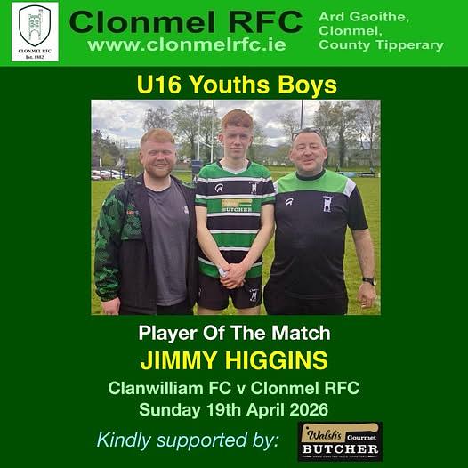 Special thanks to the Gourmet Butcher, Showgrounds SC, Clonmel for their continuous and generous sponsorship support of the U16’s Player Of The Match Award.