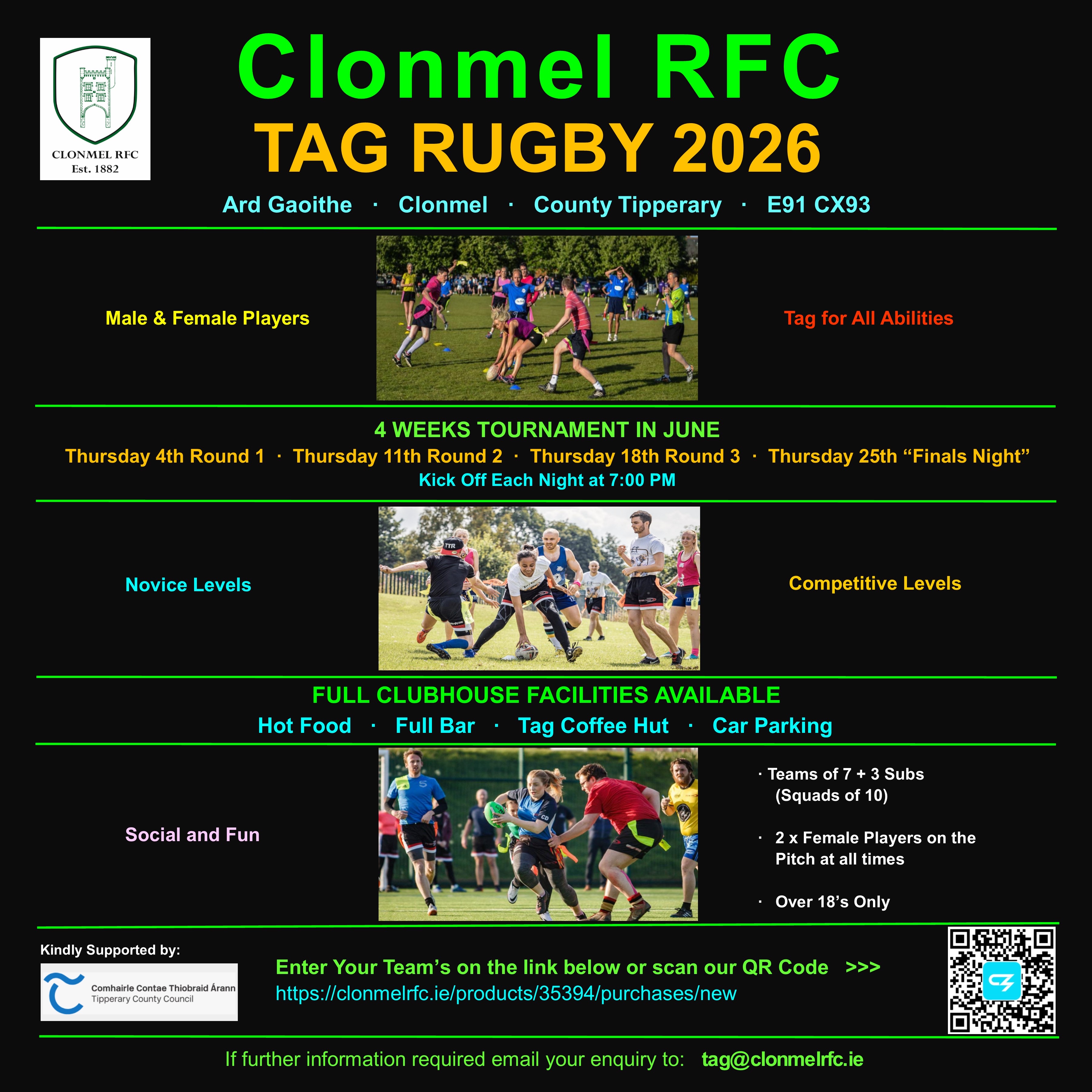 Enter a team in Clonmel RFC Tag Rugby on 4th, 11th, 18th and Finals 25th June 2026