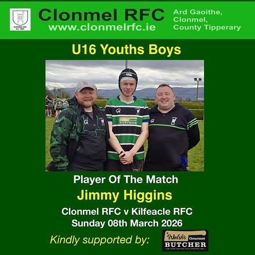 Special thanks to the Gourmet Butcher, Showgrounds SC, Clonmel for their continuous and generous sponsorship support of the U16’s Player Of The Match Award.